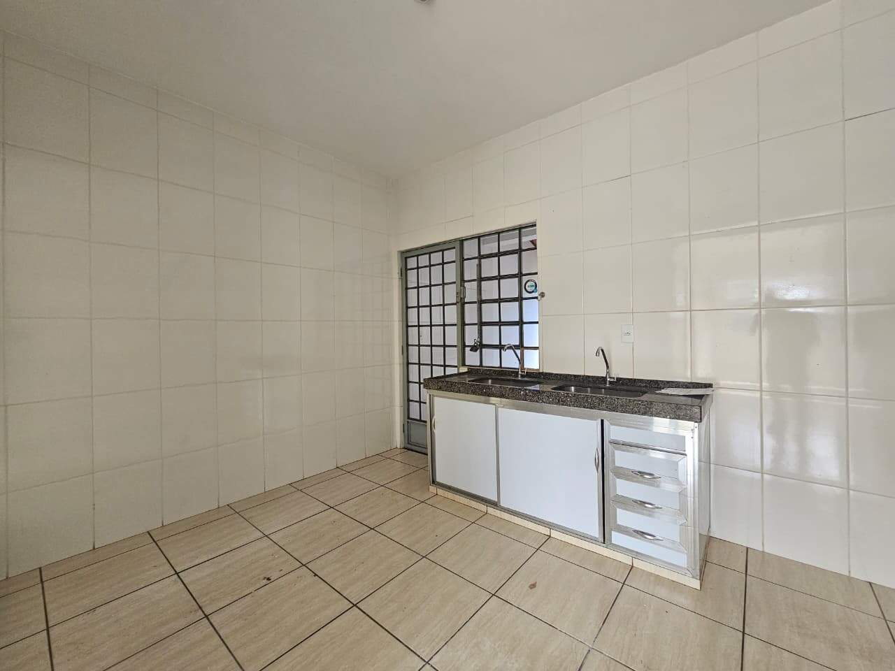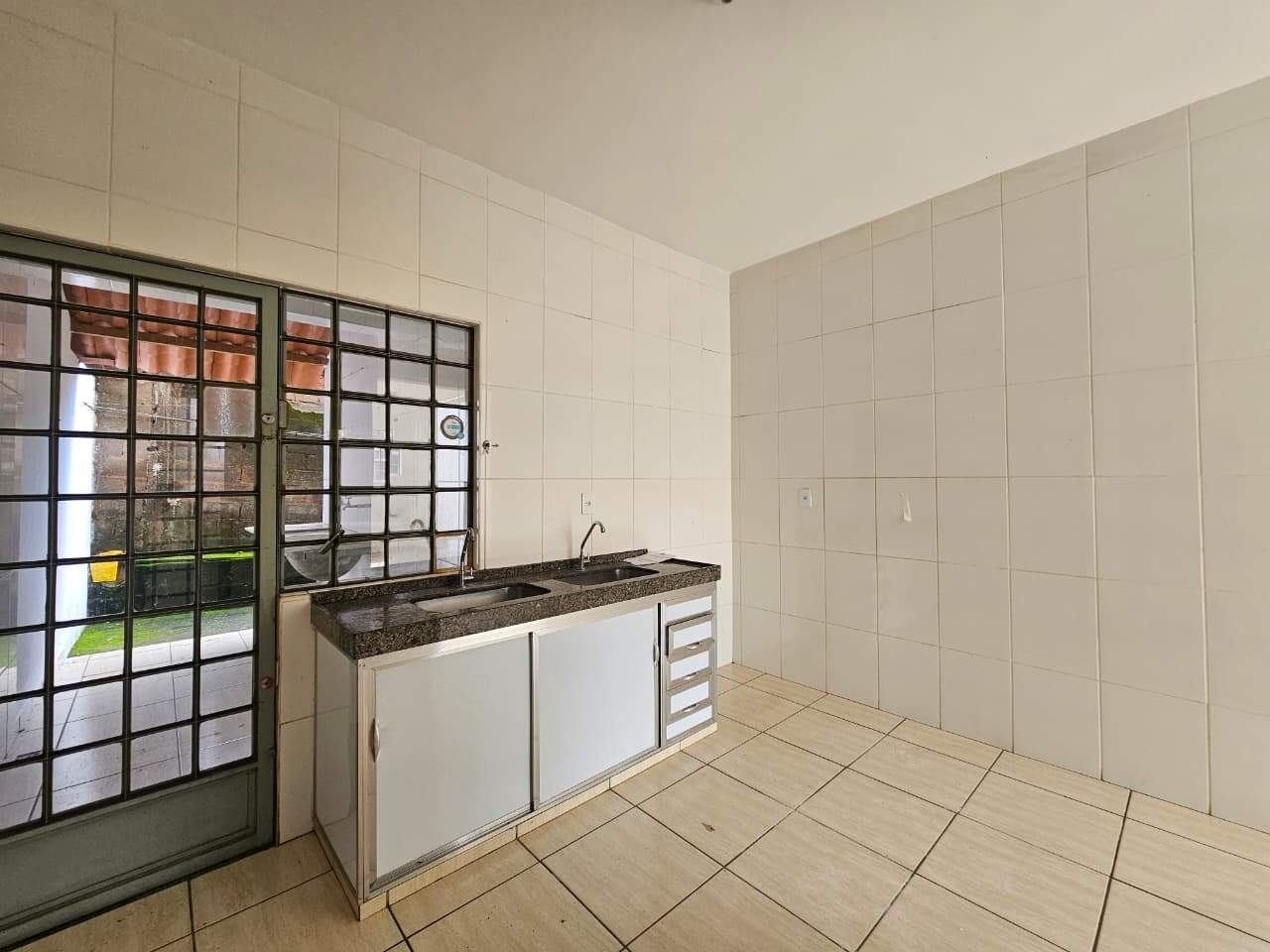 Apartamento térreo com 03 quartos, sala, cozinha com armário, banheiro social, área de serviço, área externa, piso em cerâmica, 01 vaga na garagem